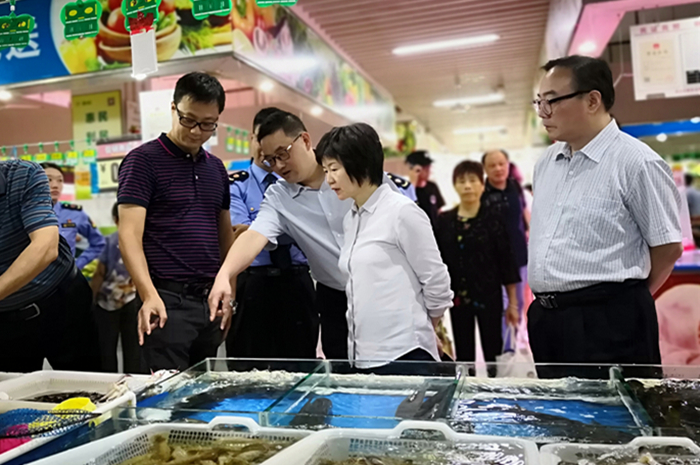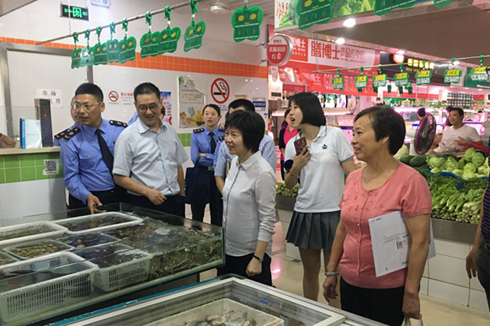 9月29日上午,為確保國慶節(jié)期間食品安全,營造和諧放心消費環(huán)境,副區(qū)長、區(qū)食藥安委主任陸祖芳,區(qū)市場監(jiān)管局黨委書記、局長丁耀臣等領導帶隊赴惠民超市新城金郡集貿(mào)市場開展食品安全檢查。區(qū)市場監(jiān)督局、區(qū)經(jīng)委、相關(guān)街鎮(zhèn)及新嘉集團(區(qū)供銷社)相關(guān)負責人陪同檢查。