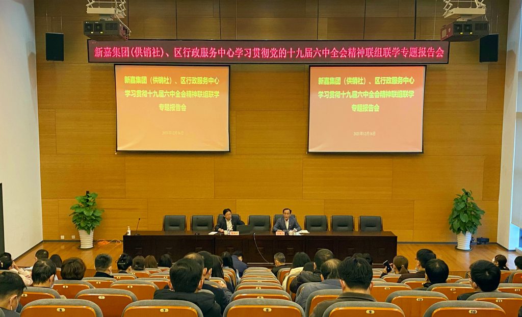 為深入學(xué)習(xí)貫徹黨的十九屆六中全會(huì)精神,推動(dòng)黨員干部職工深刻理解黨的百年奮斗重大成就,以黨的光榮歷史經(jīng)驗(yàn)推進(jìn)工作,新嘉集團(tuán)(區(qū)供銷社)與區(qū)行政服務(wù)中心于12月16日下午在區(qū)工人文化宮舉辦學(xué)習(xí)貫徹黨的十九屆六中全會(huì)精神聯(lián)組聯(lián)學(xué)專題報(bào)告會(huì)。集團(tuán)(區(qū)供銷社)黨委副書記、總經(jīng)理,區(qū)供銷社理事會(huì)常務(wù)副主任印耀華主持報(bào)告會(huì)。